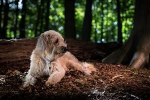 Mit Rocky, zwei Flashlights / YN 560 Mark III / einem Normalreflektor, einer Snoot und einem Stativ, habe ich unseren morgendlichen Spaziergang genutzt um ein stimmungsvolles Portrait von unserem Hund im Wald zu schießen.